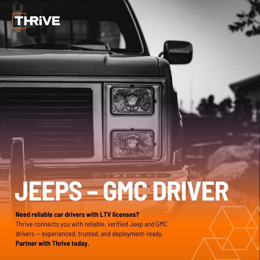 Looking for reliable Jeep & GMC drivers with LTV licenses? Thrive connects you with verified, experienced, and deployment-ready drivers you can trust. Verified drivers LTV licensed Deployment-ready Partner with Thrive today.