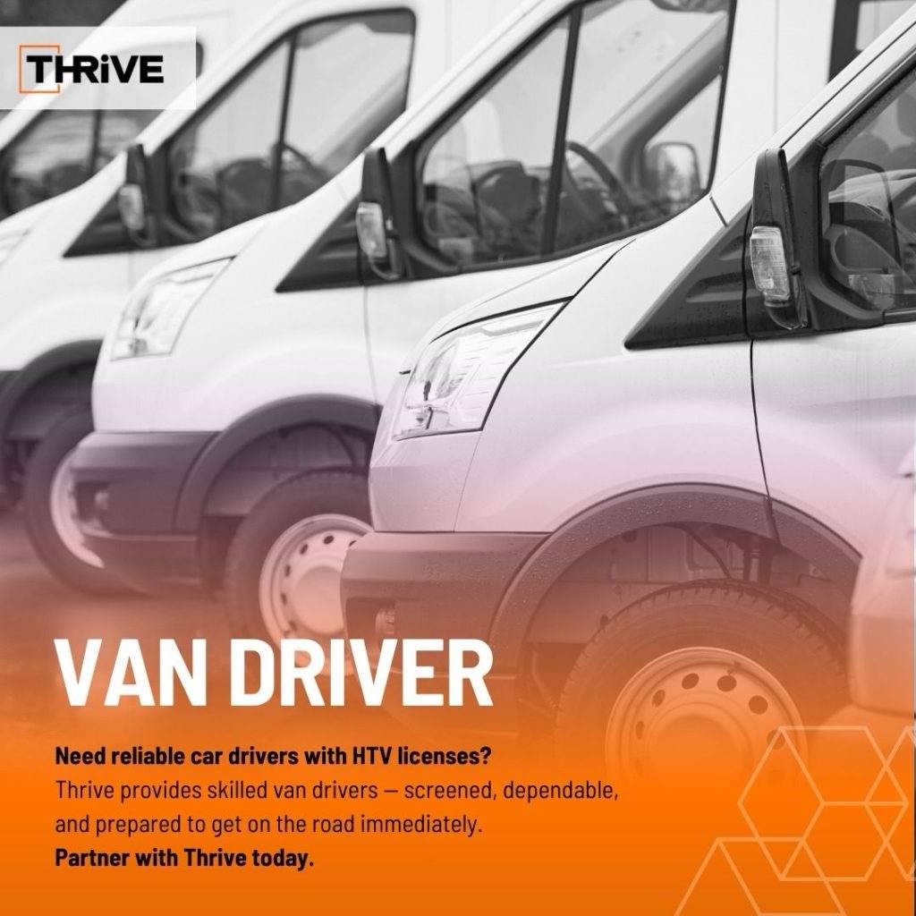 Looking for skilled and dependable van drivers with HTV licenses?Thrive connects you with licensed, verified, and road-ready drivers, prepared to start immediately. ✔️ Screened & reliable✔️ HTV licensed✔️ Deployment-ready Partner with Thrive today and keep your fleet moving.
