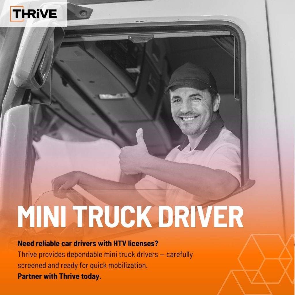 Looking for dependable mini truck drivers?Thrive connects you with licensed, verified, and deployment-ready drivers — quickly and efficiently.