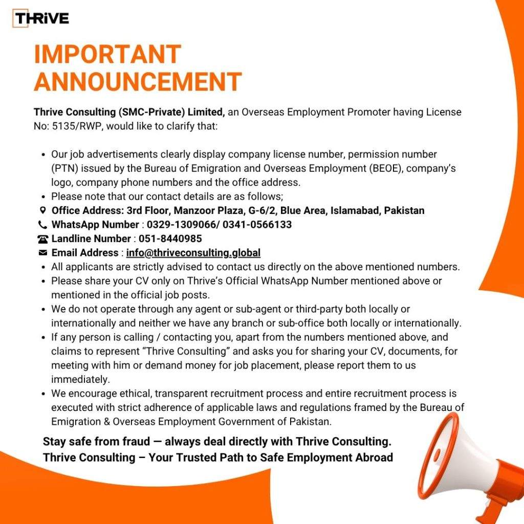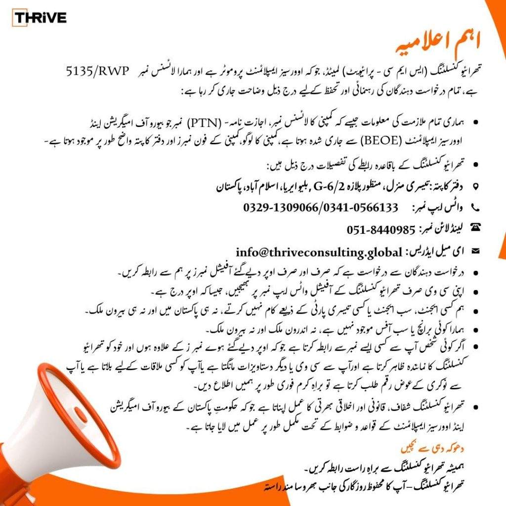 Thrive Consulting کے کوئی ایجنٹس یا ذیلی دفاتر نہیں ہیں۔ براہِ کرم صرف ہمارے سرکاری فون نمبرز اور ای میل پر رابطہ کریں۔ نیچے درج نمبرز/ای میل کے علاوہ کسی بھی ذریعے سے موصول پیغام یا پیشکش کی لازمی تصدیق کریں۔