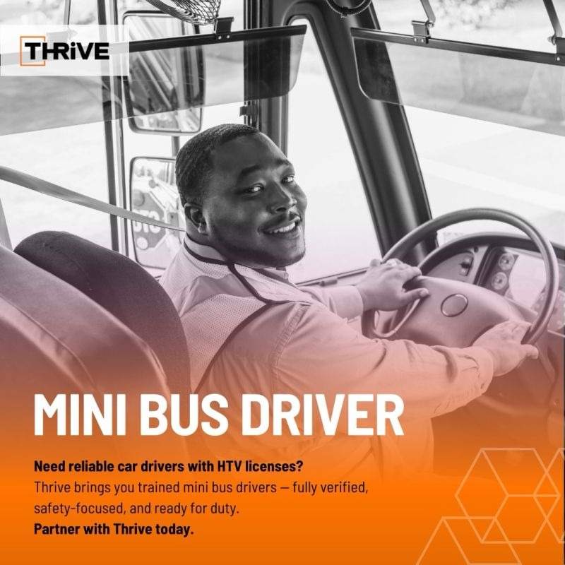 Need reliable car drivers with HTV licenses? Thrive brings you trained mini bus drivers — fully verified, safety-focused, and ready for duty.Partner with Thrive today.